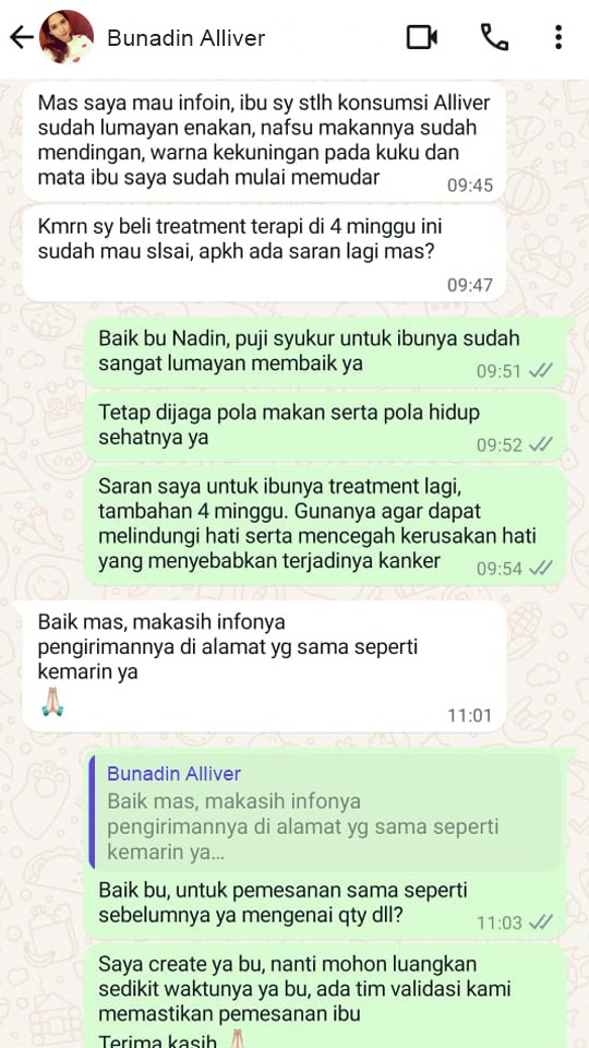 Setiap saya berkaca, saya merasa mata dan kuku jari – jari saya sedikit menguning, badan saya muda Lelah dan saya selalu merasa mual, lalu saya kedokter dan divonis HEPATITIS B, saya sempat frustasi harus bagaimana, lalu saya melihat iklan Alliver dan saya memutuskan untuk mencobanya, Allhamdullilah saat saya check-up Kembali, gejala yg sebelumnya saya rasakan perlahan sudah mulai menghilang, saya bebas beraktivitas Kembali dan tidak mudah meraskan Lelah.