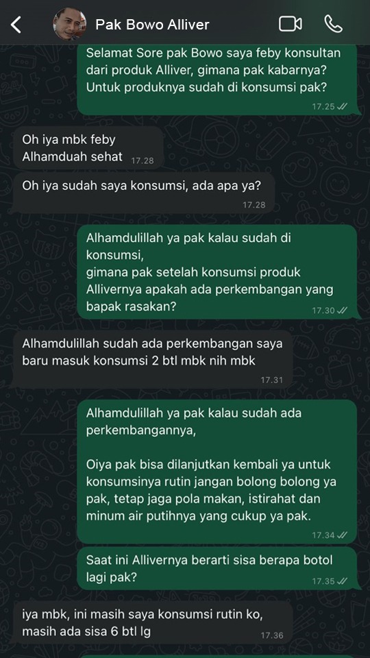 Setiap saya berkaca, saya merasa mata dan kuku jari – jari saya sedikit menguning, badan saya muda Lelah dan saya selalu merasa mual, lalu saya kedokter dan divonis HEPATITIS B, saya sempat frustasi harus bagaimana, lalu saya melihat iklan Alliver dan saya memutuskan untuk mencobanya, Allhamdullilah saat saya check-up Kembali, gejala yg sebelumnya saya rasakan perlahan sudah mulai menghilang, saya bebas beraktivitas Kembali dan tidak mudah meraskan Lelah.